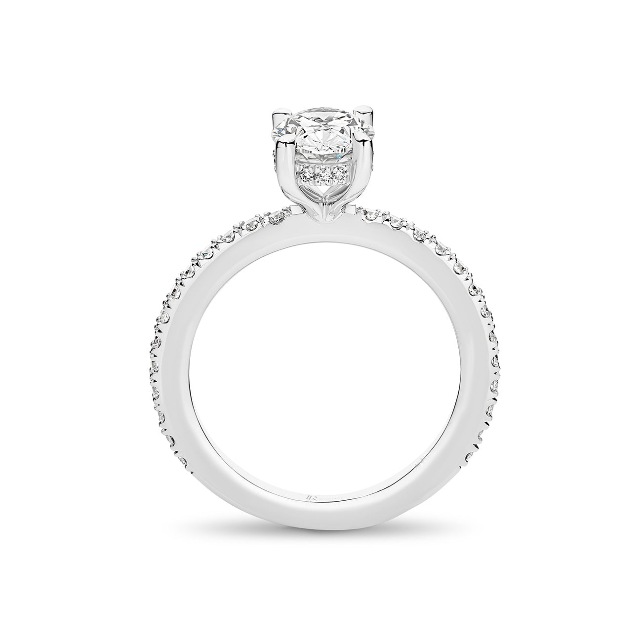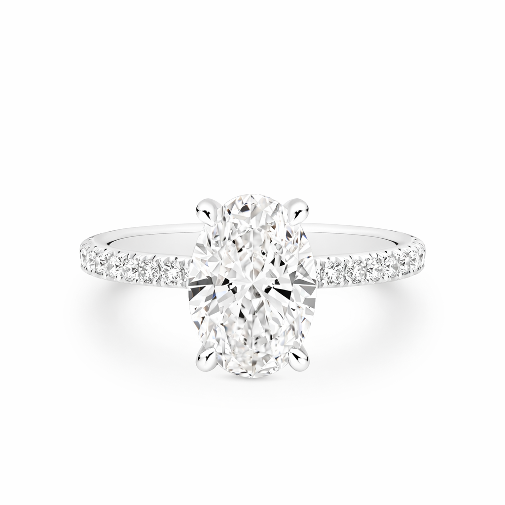 This enchanting design features a stunning Oval Brilliant Cut lab-grown diamond set in a refined four-claw setting. Beneath the centre stone sits a delicate hidden halo of Round Brilliant Cut natural diamonds, enhancing the brilliance of the centre diamond, while additional diamonds continue along the shoulders of the band for a graceful and radiant finish.